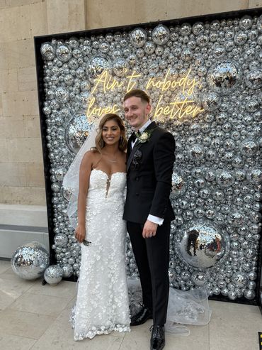 Pictured above: Vintage Photo Booth, Disco Wall, Disco Ball Décor, Ain't nobody loves me better Neon Sign